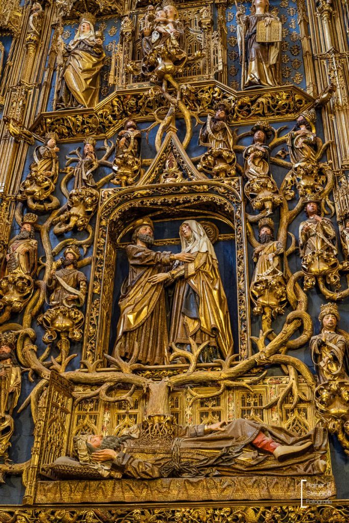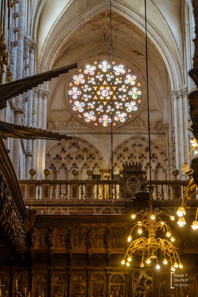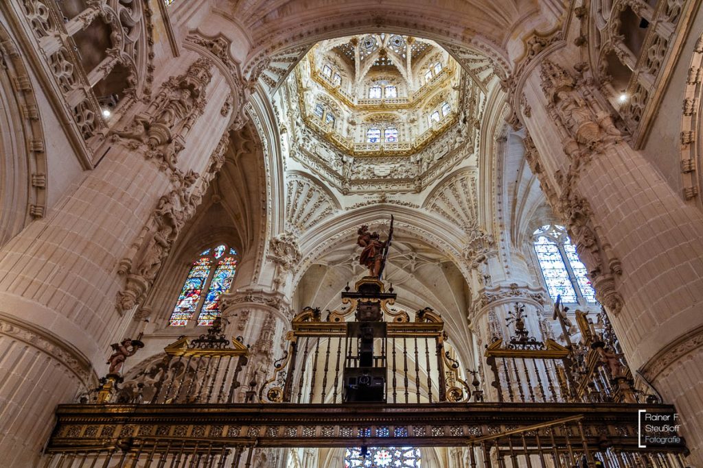 Der Bau begann vielverprechend im 12 Jahrhundert, doch dann ruhte er 200 Jahre und erst ein Rheinländer konnte die Bauruine zum Leben erwecken. Johannes von Köln, der auch an der Dombauhütte am Rhein gelernt hatte, wurde über ein paar Umwege nach Burgos geholt. Obwohl die Kölner ja auch nicht richtig voran kamen, war er nach 16 Jahren fertig. Ein wenig erinnert die Kathedrale an den Kölner Dom. Manche andere auch an einen versteinerten Wald oder sperrigen Zuckerbäckerstil. Gewaltig ist sie auf jeden Fall und nicht zu übersehen. Im Laufe der Zeit wurde sie immer weiter aus- und umgebaut. Das Innere ist prächtig und mit Kunstschätzen reich gefüllt. Mit 19 Kapellen, 38 Altären und 60 Säulen nimmt die Ausstattung die Weite der tatsächlichen Dimensionen.